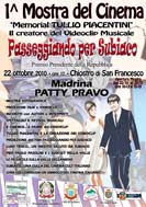 2011/02/09 - Festival di Sanremo o di Subiaco?Il vero Festival della Canzone Italiana riparte da Subiaco con la Mostra dell'audiovisivo dedicata al regista e produttore cinematografico Tullio Piacentini, il creatore del fenomeno del Videoclip Musicale. Oltre 107 canzoni ed oltre 80 cantanti big della musica leggera italiana caratterizzano questo Festival della canzone in celluloide attraverso i film musicali di Tullio Piacentini e nei quali si vedono tutti gli attuali Big della canzone italiana: l'attuale presentatore del Festival di Sanremo Gianni Morandi, Luigi Tenco, Lucio Dalla, Patty Pravo, Enzo Iannacci e decine e decine di altri ancora! 2010/11/10 - Premio Presidente della Repubblica al Memorial Tullio PiacentiniPremio Presidente della Repubblica alla MOSTRA DEL CINEMA DI SUBIACO, MEMORIAL TULLIO PIACENTINI. La "1^ Mostra del Cinema di Subiaco - Memorial Tullio Piacentini", il creatore del videoclip musicale, ha riportato numerosi ed importanti successi artistici e culturali e si è rivelata un importante contenitore di storia e di spettacolo. La proiezione del film ancora inedito "Passeggiando per Subiaco", ideato e realizzato da Tullio Piacentini nel 1967 2010/10/23 - Emozioni e brividi per Patty PravoEmozini e rividi per i cantanti PATTY PRAVO e FRANCO MECHILLI e per l'attrice MARIA RITA CARONTI, tre degli interpreti dell'inedito film 'Passeggiando per Subiaco' girato da Tullio Piacentini nel lontano 1967 e presenti alla proiezione in anteprima di ieri sera a Subiaco. Il Sindaco di Roma, Gianni Alemanno, ha telefonato sul cellulare dell'Assessore al Turismo di Subiaco per dire che con dispiacere non sarebbe riuscito a presenziare all'evento. 2010/10/22 - 1^ Mostra del Cinema di Subiaco Memorial Tullio Piacentini1^ MOSTRA DEL CINEMA DI SUBIACO MEMORIAL TULLIO PIACENTINI. Subiaco (Roma), dal 22 ottobre al 21 novembre 2010. Madrina della mostra Patty Pravo. Ospiti Michele e Margherita Ginevra Piacentini (figli del cineasta Tullio), Irene Fuertes-Piacentini (vedova del cineasta Tullio), Franco Mechilli e Maria Caronti (interpreti, insieme alla cantante Patty Pravo, dell'inedito film "Passeggiando per Subiaco"), il Sindaco Pierluigi Angelucci e l'assessore alle Politiche Giovanili di Subiaco Matteo Berteletti. 2010/10/21 - Memorial Tullio PiacentiniMOSTRA DEL CINEMA DI SUBIACO - Memorial Tullio Piacentini. Il giorno 22 ottobre, alle ore 17:00, si apriranno i battenti della "1^ Mostra dell'Audiovisivo e del Cinema di Subiaco - Memorial Tullio Piacentini", il creatore del videoclip di successo e sarà presente come Madrina dell'evento la cantante PATTY PRAVO, che proprio a Subiaco girò il suo videoclip sulle note del brano "Qui e là" contenuto nell'inedito film "Passeggiando per Subiaco" e girato dal regista Tullio Piacentini. |