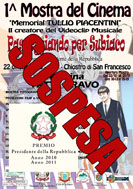 2014/07/24 - Comunicato: 4^ Mostra del Cinema di SubiacoIn data 31 ottobre 2013 era stata presentata agli enti pubblici di competenza la domanda di finanziamento per realizzare la 4^ Edizione della Mostra del Cinema di Subiaco - Memorial Tullio Piacentini che, a tutt'oggi, non ha trovato riscontri ufficiali ne tantomeno conferme di delibere di approvazione o comunicazioni di rigetto. 2014/01/28 - La Mostra del Cinema di Subiaco ringrazia le istituzioniL'Organizzazione della '3^ Mostra del Cinema di Subiaco - Memorial Tullio Piacentini', svoltasi a marzo 2013 a Subiaco (Roma), ringrazia il Comune di Subiaco e la Regione Lazio per i Patrocini ed il supporto economico recentemente concesso. In un periodo sociale di crisi della fiducia verso le istituzioni, questa Organizzazione vuole invece ringraziare l'amministrazione comunale della Città di Subiaco per aver creduto concretamente alla manifestazione 2013/08/10 - Subiaco sotto le stelleSabato 10 agosto 2013, la Città di Subiaco festeggia il suo Patrono a ritmo di Rock & Blues, il cui Festival è giunto questo anno alla 25^ Edizione, abbinando la proiezione dell'inedito film 'Passeggiando per Subiaco' (1967) del regista produttore Tullio Piacentini ed invitando il figlio Michele. All'iniziativa è stata abbinato il concorso di design per la realizzazione della t-shirt 'Passeggiando per Subiaco'. 2013/03/16 - 3^ Mostra del Cinema di Subiaco Memorial Tullio PiacentiniClicca sopra l'immagine per guardare il video. Dal 16 al 24 marzo 2013 si è svolta la terza edizione della Mostra dedicata alla figura di Luigi Tenco: 'Passeggiando per Subiaco, Ricordo un ragazzo, di nome Luigi Tenco'. 'Passeggiando per Subiaco' è il titolo del film musicale realizzato nel 1967 dal regista-produttore Tullio Piacentini in cui appare, tra altri cantanti noti (Patty Pravo, Lucio Dalla, Fred Bongusto, ecc.), il gruppo Le Pecore Nere 2013/03/13 - Gli Ospiti e i Testimonial della Mostra del Cinema di Subiaco13 marzo 2013: Gli Ospiti e i Testimonial della 3^ Mostra del Cinema di Subiaco – Memorial Tullio Piacentini dal titolo “Passeggiando per Subiaco, Ricordo un ragazzo, di nome Luigi Tenco”, con la proiezione del film inedito "Passeggiando per Subiaco" contenente i video di Lucio Dalla, Patty Pravo, Mal & The Primitives, Nicola Di Bari e tanti altri ancora e con la partecipazioni di illustri band e musicisti che si esibiranno sui brani di Luigi Tenco. Rassegna video-fotografica e concerti musicali, dal 16 al 24 marzo 2013 presso la Sala Braschi di Subiaco (Roma), Piazza S. Andrea. 2012/12/08 - Sospesa la Mostra del Cinema di Subiaco Memorial Tullio Piacentini8 gennaio 2013: COMUNICATO STAMPA INCONTRO SINDACO-PIACENTINI 2011/08/28 Premio Presidente della Repubblica 2011PREMIO PRESIDENTE DELLA REPUBBLICA 2011. Subiaco (Roma), il 28 agosto 2011. E' direttamente il Sindaco di Subiaco, Francesco Pelliccia, a consegnare nelle mani di Michele Piacentini la medaglia inviata dalla Presidenza della Repubblica Italiana 2011/08/21 - 2^ Mostra del Cinema di Subiaco Memorial Tullio Piacentini2^ MOSTRA DEL CINEMA DI SUBIACO - MEMORIAL TULLIO PIACENTINI. Subiaco (Roma), dal 21 al 28 agosto 2011. Ospiti all'inaugurazione l'Editore Michele Piacentini (figlio del cineasta Tullio), Massimo Cosimi (figlio del fotografo Duilio Cosimi), l'Assessore ai Lavori Pubblici e l'Assessore alle Politiche Giovanili di Subiaco. 2011/07/20 - E’ italiano il primo format tv di videoclipOrmai è risaputo, è italiana l’invenzione dei videoclip musicali. Lo aveva scritto l’autorevole giornalista Rai Michele Bovi nel suo libro “Da Carosone a Cosa Nostra” e ne ha dato conferma l’Editore Michele Piacentini mettendo a pubblica disposizione parte del materiale video-cinematografico realizzato dal padre negli anni 1959-1967.