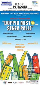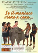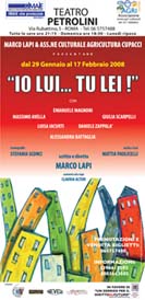 2014 - Videoclip Story 50Years (Video Promo)Clicca sopra l'immagine per guardare il video. VIDEOCLIP STORY, a pochi mesi dalla ricorrenza dei 50 Anni del Videoclip, sull’invenzione italiana dei “Filmati Musicali” a colori, sceneggiati e prodotti per la promozione delle canzoni e dei cantanti e divulgati al grande pubblico nel 1965 attraverso la loro proiezione nelle sale cinematografiche romane che gestiva l’esercente Tullio Piacentini, diventando il creatore del fenomeno dei Videoclip poi diffusi in tutto il mondo con i network televisivi. 2013 - Ma un porta-fortuna... porta fortuna?Torna in scena l’acclamato spettacolo di teatro comico sui “porta-fortuna…”, scritto, diretto ed interpretato da Fabrizio Bracconeri. Con lui recitano Luigi Amodeo, Annalisa Calanducci, Claudio Meloni e Lucy Busy. Fabrizio Bracconeri, dopo la fortunatissima serie tv “I ragazzi della 3^C” 2008-10-14 - Se il maniaco viene a cenaSE IL MANIACO VIENE A CENA. Roma, dal 14 al 26 ottobre. Regia di Salvatore Scirè, con Debora Bernardini, Nicoletta Candeloro, Francesca Pellegrino, Micaela Pellegrino, Andrea Villanetti. 2008-02-19 - C'è post@ per treC' E' POST@ PER TRE. Roma, dal 19 febbraio al 2 marzo 2008. Regia di Marco Lapi, con Anna Tognetti, Silvia Moreni e Alessia Cristiani. 2008-01-29 - Io lui... tu lei!IO LUI... TU LEI. Roma, dal 29 gennaio al 17 febbraio 2008. Regia di Marco Lapi, con Emanuele Magnoni, Massimo Avella, Giulia Scarpelli, Luisa Iacurti, Daniele Zappalà, Alessandra Battaglia. 2008-01-08 Doppio misto... senza palleDOPPIO MISTO SENZA PALLE. Roma, dall'8 al 27 gennaio 2008. Regia di Marco Lapi, con Marcos Mattioli, Loana Gloriani, Walter Palamenga, Flavio Domenici, Francesca La Scala. |